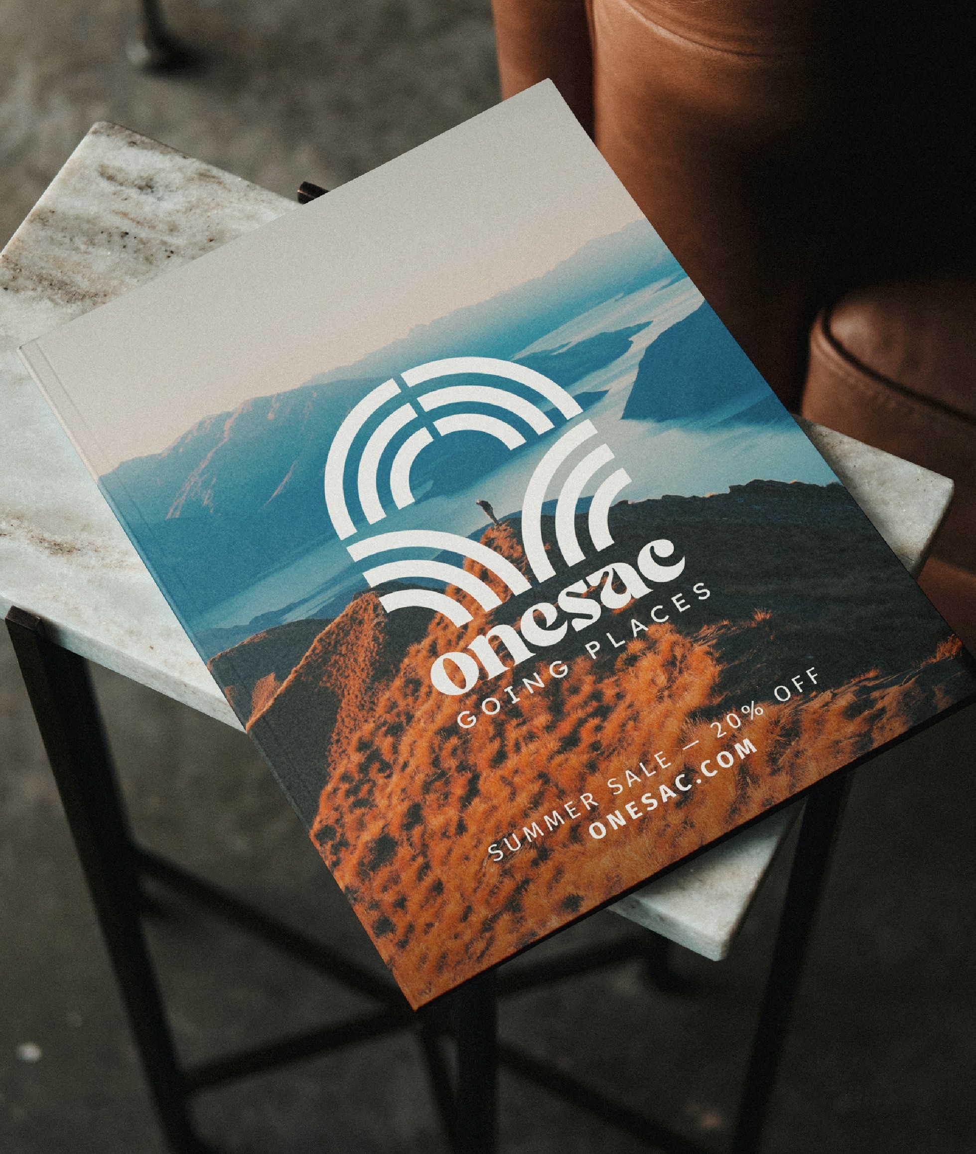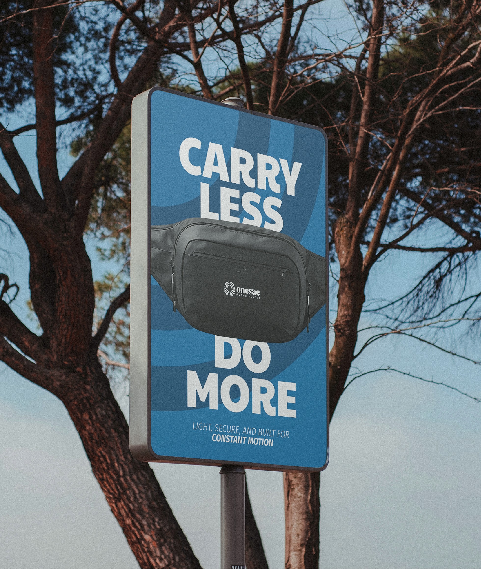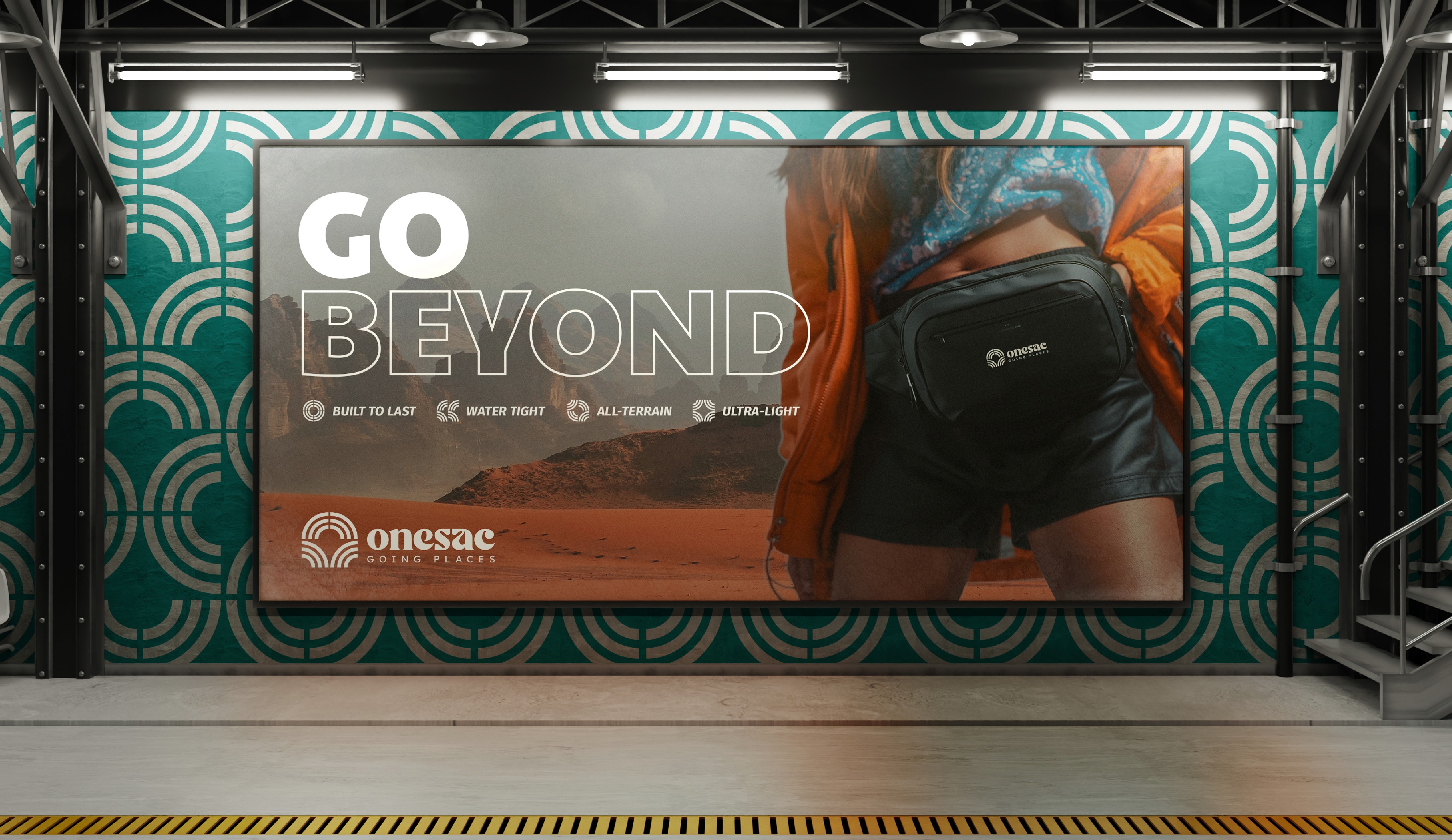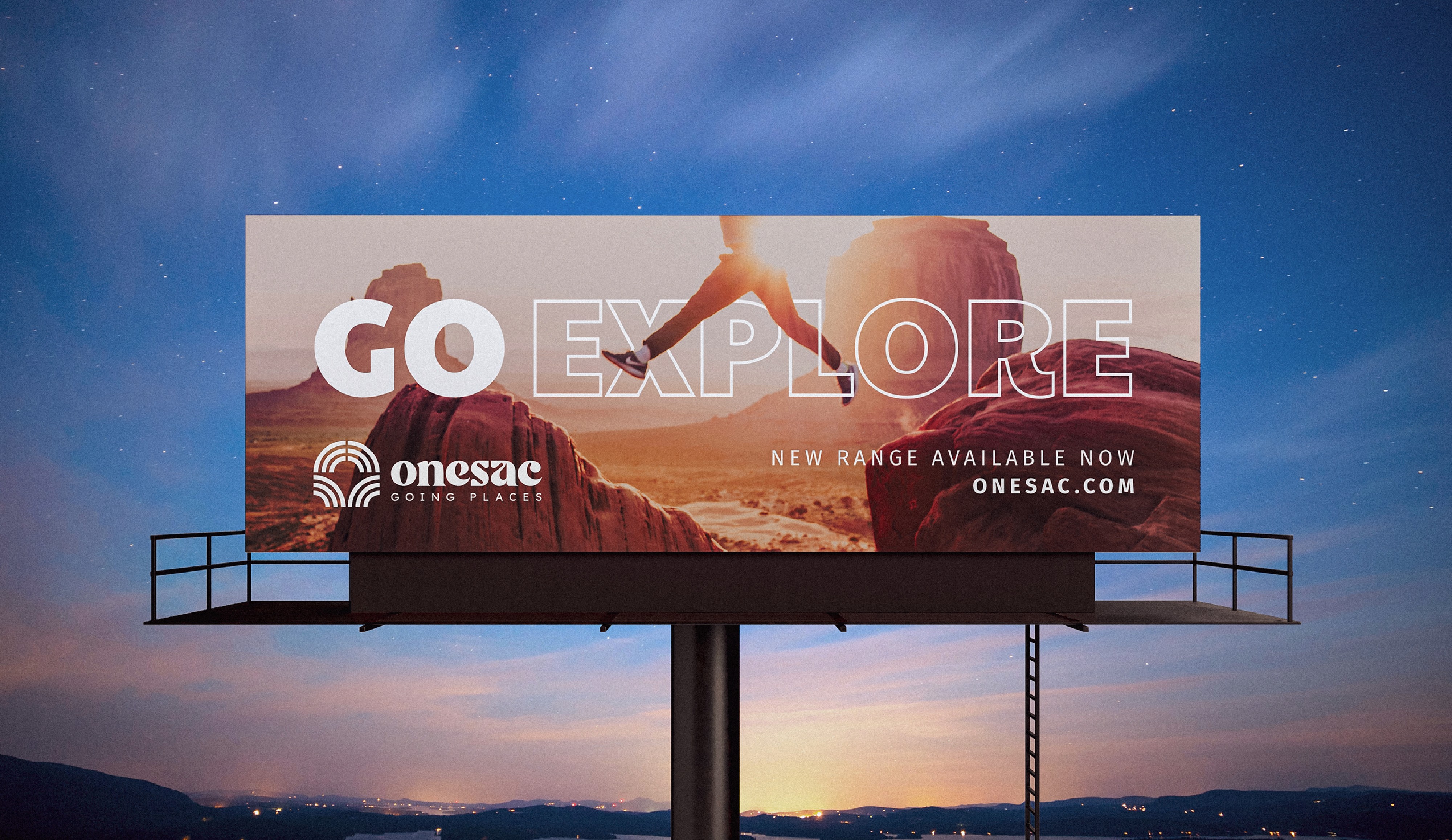 Onesac is an all-weather, 5-in-1 adventure pack built to carry everything you need — and nothing you don’t. Designed for the everyday explorer, it moves seamlessly between trail, travel, sport and city life. To match that versatility, the brand needed an identity with the same adaptability. Inspired by the pack’s modular nature, we developed a system of interchangeable segments that divide the plane — a flexible graphic language that works at any scale and comes to life through motion. This forms the backbone of a wider visual ecosystem. We also crafted a custom wordmark from scratch: hand-drawn, rugged in spirit, and shaped with adventure in mind. At its core, the brand is about creating a lifestyle — one defined by movement, momentum and possibility. Built around the strategic line Going Places, the tone is punchy, direct and optimistic, giving the brand a clear “get up and go” attitude that inspires people to step out, explore, and push beyond the everyday.
